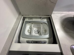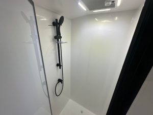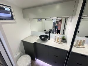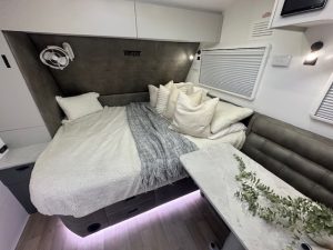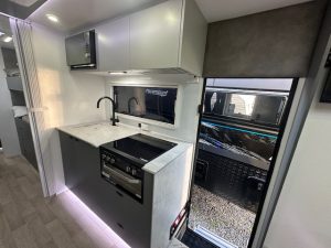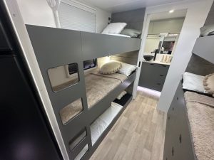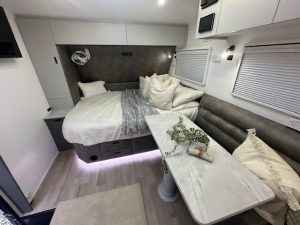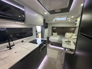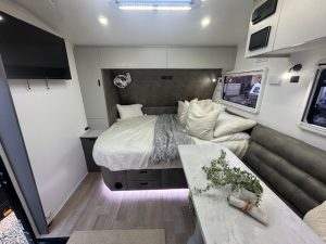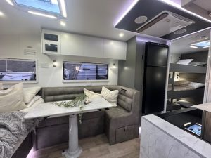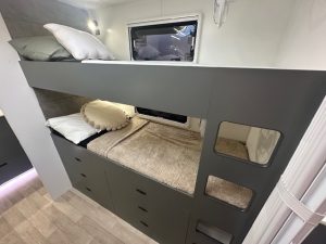 Walking through this FIVE BUNK layout. As you step into this layout the left you have a large queen bed with a full-height bed head, an upholstered bed base with strip lighting. Sirocco fan in the bed head provides you with year round comfort and air movement. Walking through tio the centre of the the caravn your greeted with an L-shape lounge and kitchen space. The kitchen has a 4 burner stove with mini grill, microwave, range hood, and stone composite benchtops! The under-bench mounted sink has a stone cover to give more bench space while the sink isn’t in use.