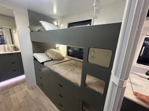 Walking through to the bunk area, this has three bunks on one side and two on the other offering two large banks of drawers for the kids. A Sirocco fan has been installed in each bunk along with reading lamps, power points, and USB charging points.