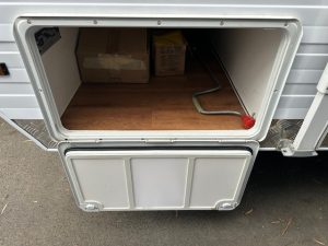Externally the caravan has been well maintained. Sitting on a 4” chassis 15” rims. On the A-frame you have a spare wheel and twin 9KG gas bottles located under a custom made gas bottle cover. The caravan has a front tunnel boot, roll out awning and a picnic table.