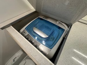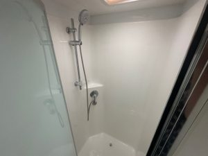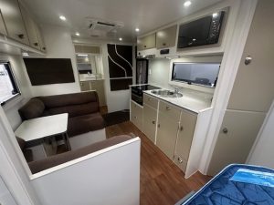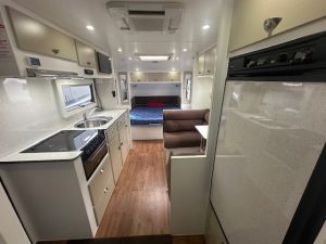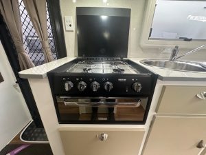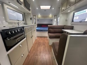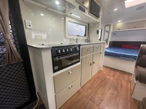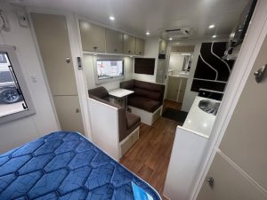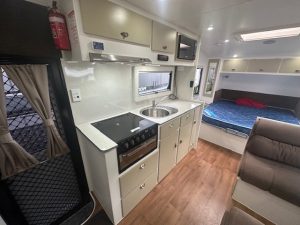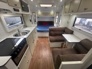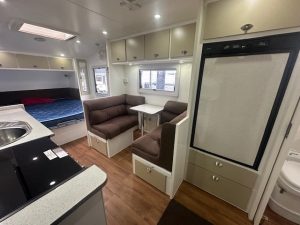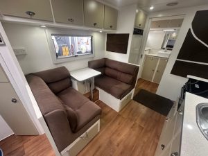 As you step into this rear door layout. To the right you have a full size ensuite with full shower, toilet, 2.5KG top load washing machine basin and lots of cupboard and bench space. Going through to the centre of the caravan you have a kitchen on your awning side. The kitchen is complete with 4 burner cook top, griller, pull out pantry, microwave and a 3-way fridge. Opposite the kitchen is café lounge with tri fold table. This lounge is finished in a beautifully soft fabric and the back supports are very plush.