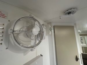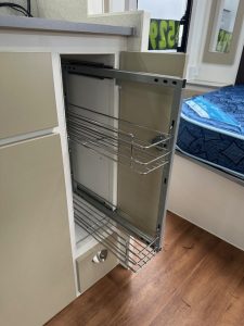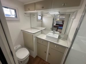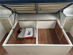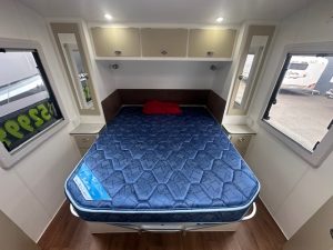 Walking through to the rear of the caravan there is a queen bed with robes and over head cupboards. The bed can be lifted up and more storage found below.
