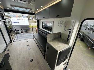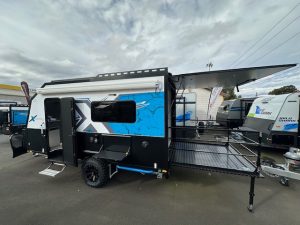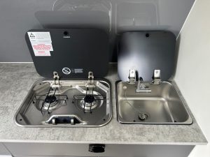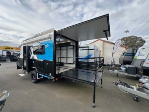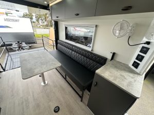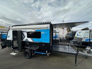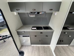 Stepping into the front door layout to the front you have your kitchen with a two-burner cooktop, sink, rangehood and mini fridge. Tucked behind a mirror door is a combo shower toilet. Walking through to the centre of the caravan you have a drop down lounge and removable table with leg. At night you can drop down the double bed to recharge the batteries for an adventure filled day ahead!
