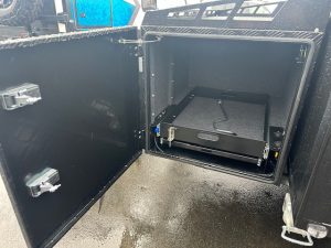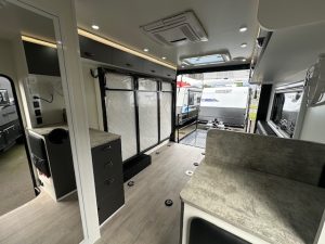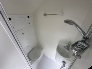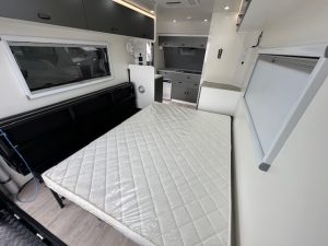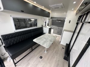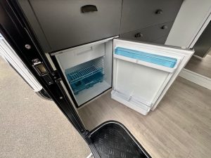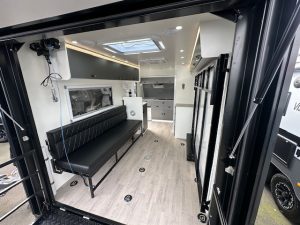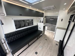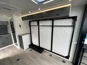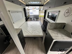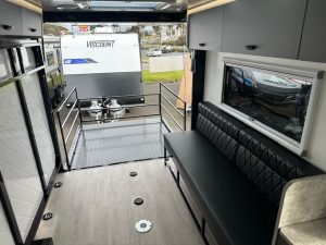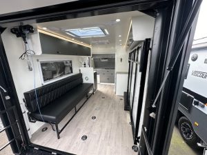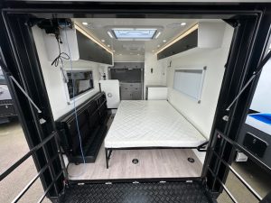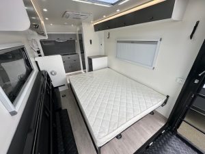 Inside the main cabin you have your main bed. Fold down lounge, mini fridge, ensuite room with toilet and shower as well as storage throughout.