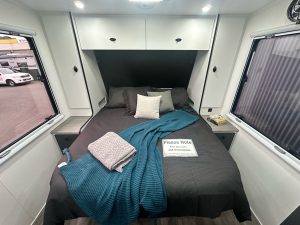 Walking through to the front of the caravan your bedroom has a Queen lift up bed with under bed storage. Twin robes and fantastic size over head cupboards.