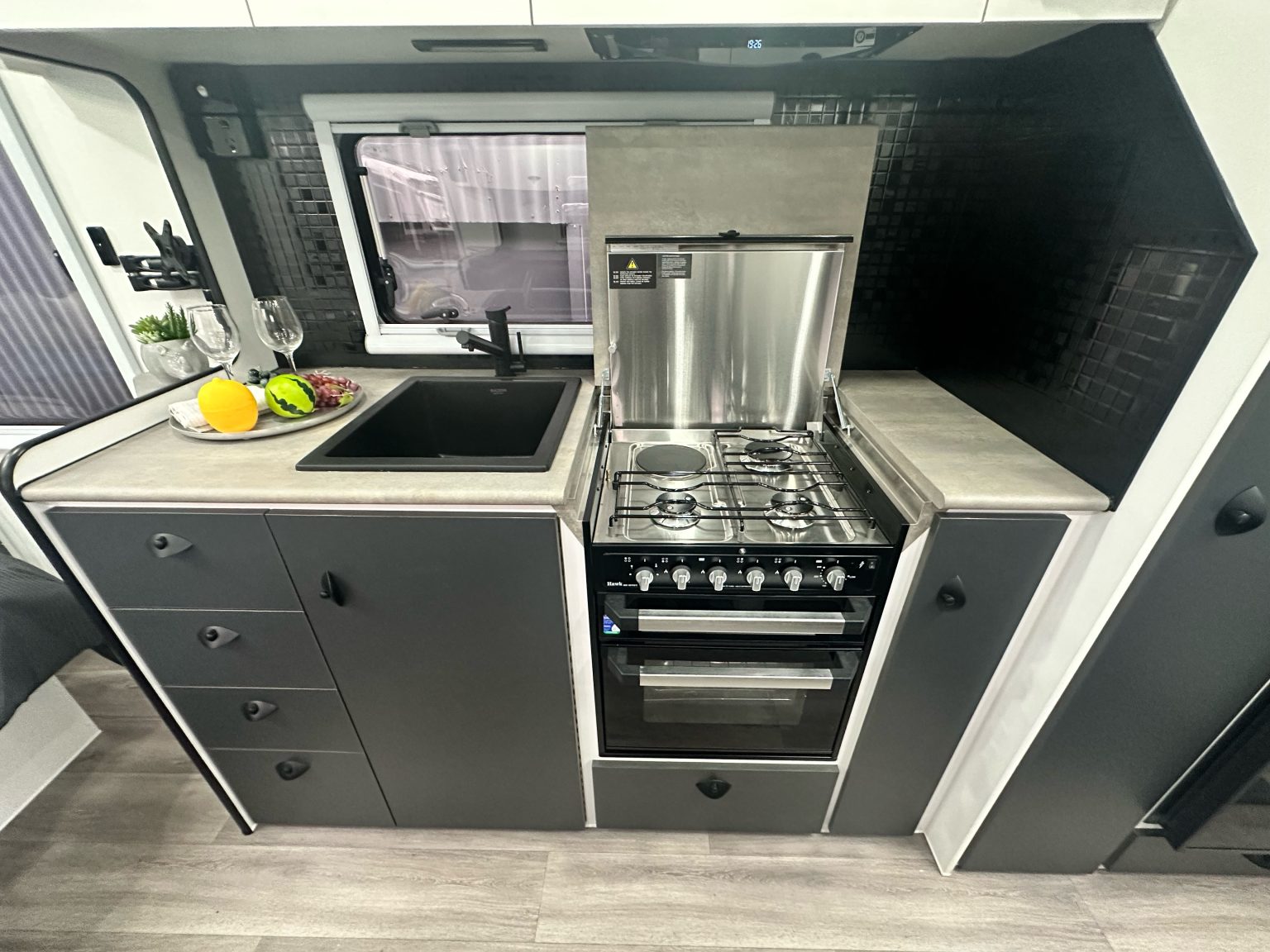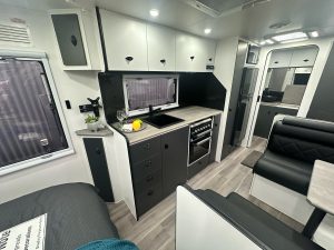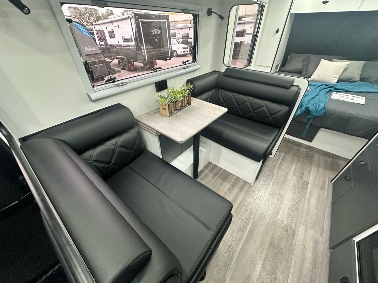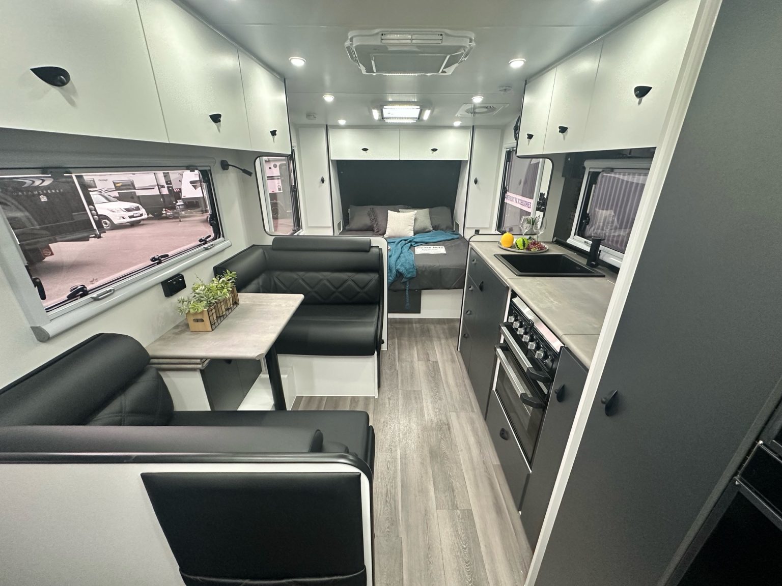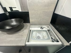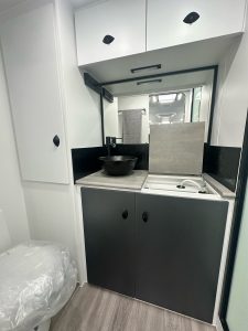 Stepping into the caravan to the right you have a full size ensuite with swivel toilet, generous linen cupboard, stylish black surface mounted sink and under bench washing machine. The shower offers a very generous space.