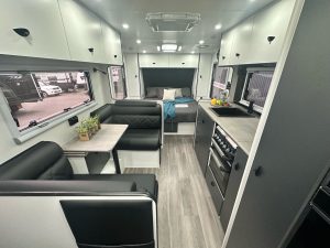 Walking through to the centre of the caravan you have a café lounge with trifold table on the awning side. Opposite the kitchen is presented with a full oven with griller and 4-burner cook top. A discreet rangehood, microwave, full height pantry and large 188L 3-way fridge.