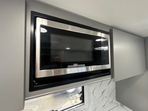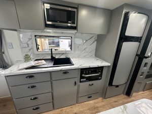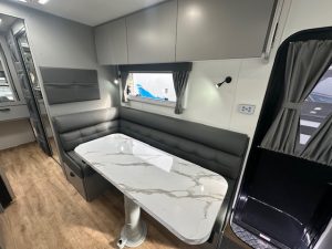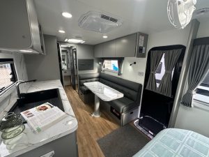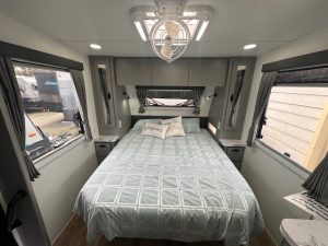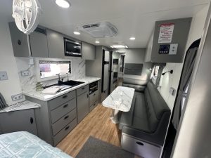 The 21’6 Signature series is a very popular family layout. As you walk into this van you have a queen island bed complete with robes and overhead cupboards. Inside the bottom of the robes, you have port holes with power and lights with space to charge the phones and items you would place on a bedside table.