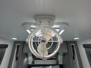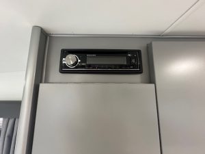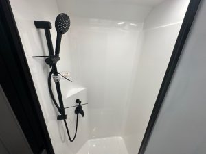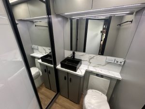 As we enter the bunk area this is closed off by a concertina door. This particular van is only fitted with 2 bunks however 3 are optional when ordering. The benefit of 2 bunks is additional storage space underneath the bottom bunk by the access of an external door. The ensuite is finished with a glass mirror door however can be replaced with a concertina door if you wish to fully open up the area. The shower is a comfortable sized with toiletry cabinet, basin & bench space over the ceramic toilet.