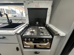The outside of the caravan is featured with the new Dark charcoal metallic composite cladding. This really brings style to the outside overall look and feel. The front A-frame is extended to fit a 4-arm GripSports bike rack and large front box. This way you can take away all the bikes and still be left with plenty of storage space. No stone has been left unturned in this fully functional family bunk caravan.
