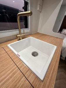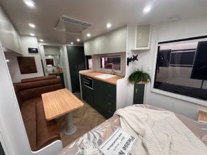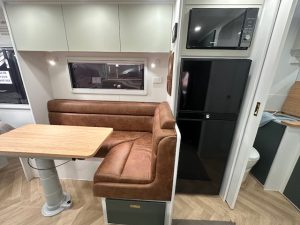 Inside, the Little Cote feels bright, modern and thoughtfully designed. A comfortable queen lift-up bed with innerspring mattress provides excellent under-bed storage, while the café or L-shape seating creates a relaxed dining and lounge space. The kitchen is well equipped with a gas/electric mini grill, 188L 3-way fridge, rangehood, generous bench space and a stylish white granite sink complemented by a brushed brass tapware pack for a premium finish. A washing machine, roof-mounted air conditioner, hot water system, Smart TV and Bluetooth audio system ensure you travel in comfort no matter the season.