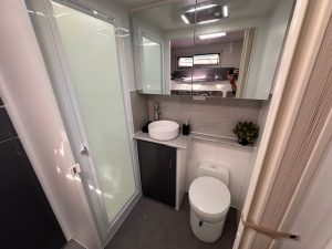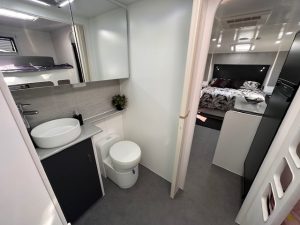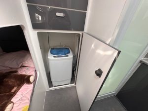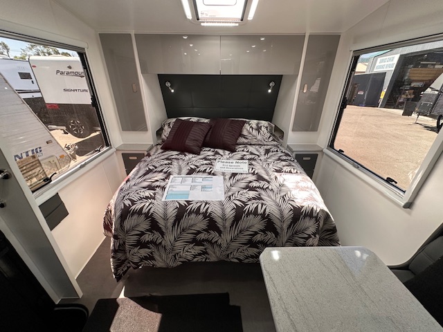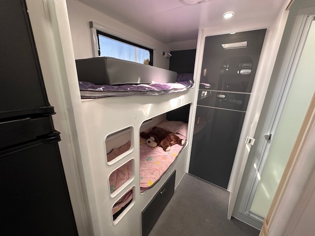 At the front of the caravan, the queen bed creates a peaceful retreat for parents, complete with excellent storage and easy access from both sides. Thoughtfully positioned away from the children’s sleeping quarters, it offers privacy and comfort, making longer trips far more enjoyable.