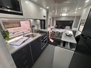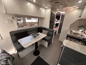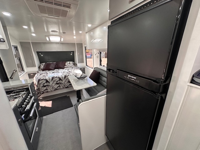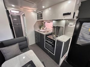 The centre of the van is dedicated to everyday living, featuring a well-appointed kitchen paired with a spacious lounge area that quickly becomes the heart of the caravan. Whether you’re preparing meals, sharing family dinners or unwinding after a day of adventure, this open and functional space supports it all. Generous bench space, modern appliances and clever cabinetry ensure there is a place for everything, helping keep the interior organised even on extended holidays.