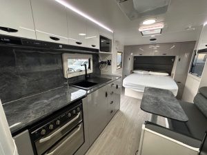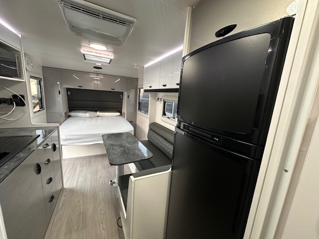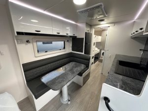 The central living area forms the heart of the caravan, with a functional kitchen and inviting lounge that make travelling feel effortless. There is ample bench space for meal preparation along with practical storage throughout, ensuring you can pack everything the family needs without feeling cramped. The dining and lounge area offers a comfortable spot for shared meals, movie nights or simply relaxing together.