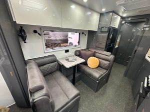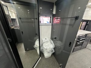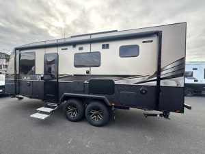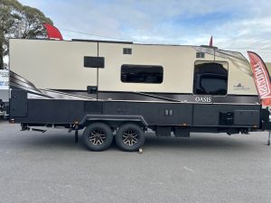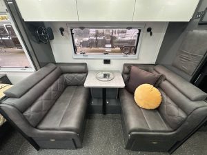Walking into this front door layout you’re greeted with to your left a queen-sized island bed with twin robes, sirocco fans, and a lift-up bed for additional travel storage. Walking through to the centre of this caravan you have a café lounge and opposite an angle kitchen complete with an oven, rangehood, microwave, and stylish black sink. The kitchen has a big 188L fridge. Going through to the rear of the caravan the ensuite is sure to impress! Feel the space, luxury, and storage features of this ensuite. More linen/robe space, washing machine, full-size shower and toilet.